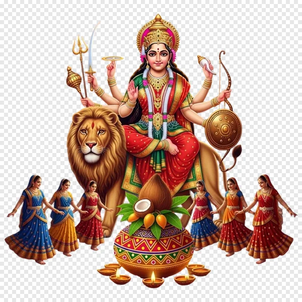 Tags: Diwali Durga Maa Durga Puja Hindu Goddess Hindu religion Indian Festival Navratri cultural devotees devotional art divine diya kalash lion multi-armed puja sacred spiritual traditional dress transparent PNG