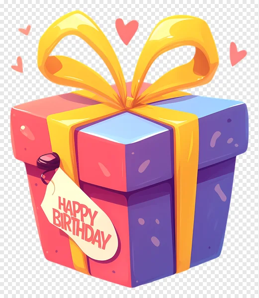 Celebrate in style with our vibrant Happy Birthday Gift Box PNG! This eye-catching, free-to-download image features a colorful cartoon present adorned with a bright yellow ribbon, a cheerful 'Happy Birthday' tag, and whimsical pink hearts floating around. Perfect for adding a festive touch to your birthday cards, party invitations, digital designs, social media posts, or any creative project. Its transparent background makes it easy to integrate into any design. Get this high-quality, charming illustration instantly for your personal or commercial use. Download now and make your birthday greetings pop!