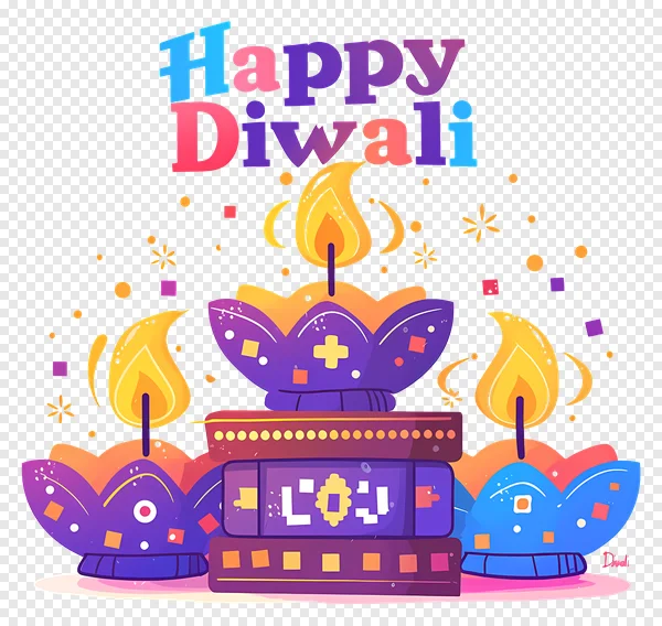 Brighten your festive designs with this joyful 'Happy Diwali' PNG illustration. Featuring beautifully lit, stylized diyas in vibrant purple, blue, and orange hues, set against a dark background with sparkling confetti and decorative elements. The modern cartoon style and bold, colorful lettering make it perfect for conveying cheer. Download this high-quality, transparent PNG for free to enhance your greeting cards, social media posts, event invitations, or website banners. Ideal for anyone celebrating the Festival of Lights with a contemporary touch. Get your free Diwali graphic today!