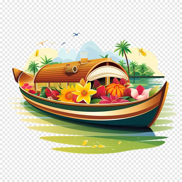Imagine a tranquil tropical escape with this stunning free PNG of a vibrant houseboat. Adorned with a beautiful array of colorful flowers, including bright sunflowers and serene lotus blooms, this traditional Kettuvallam floats gracefully on calm backwaters. Lush green palm trees, distant hills, and playful birds complete the idyllic scene. Perfect for travel blogs, presentations, digital art, or any project needing a touch of exotic beauty. Download this high-quality, transparent background vector illustration today and bring the serenity of a tropical paradise to your designs!