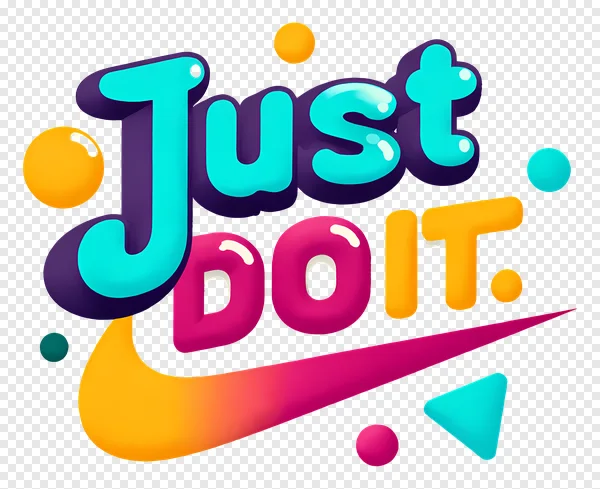 Download this eye-catching 'Just Do It' Nike logo PNG for free! Featuring a vibrant 3D bubble text design with glossy turquoise, hot pink, and orange letters outlined in deep purple, this image also showcases the iconic Nike swoosh in a stunning orange-to-pink gradient. Scattered colorful spheres add a playful touch. Perfect for adding a pop of motivation and modern style to your social media graphics, personal projects, presentations, or digital art. Get this high-quality, transparent PNG today to inspire action and boost your creative work!