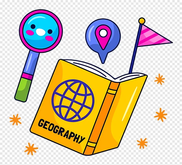 Explore the world of geography with this charming and free PNG image! It showcases a bright yellow geography book adorned with a globe, alongside a playful kawaii magnifying glass with a cute face, a prominent blue and pink location pin, and a festive pink striped flag, all set against a transparent background. Surrounded by cheerful orange starbursts, this versatile graphic is perfect for designing engaging lesson plans, creating digital content for educational apps, enhancing travel-themed projects, or adding a friendly touch to any learning material. Ideal for teachers, students, and content creators, download this high-quality illustration instantly to add a pop of color and a fun, educational vibe to your designs!