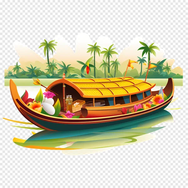 Immerse your projects in the serene beauty of South India with this stunning Kerala Houseboat illustration. This free PNG features a beautifully rendered traditional Kettuvallam, complete with its iconic golden thatched roof and vibrant floral decorations, gently floating on calm backwaters. Lush green palm trees and a soft, tropical landscape frame the scene, evoking a sense of tranquil exoticism. Perfect for travel blogs, presentations, cultural studies, graphic design, or educational materials. Download this high-quality vector image with a transparent background instantly and bring the charm of Indian backwaters to life in your creative work!