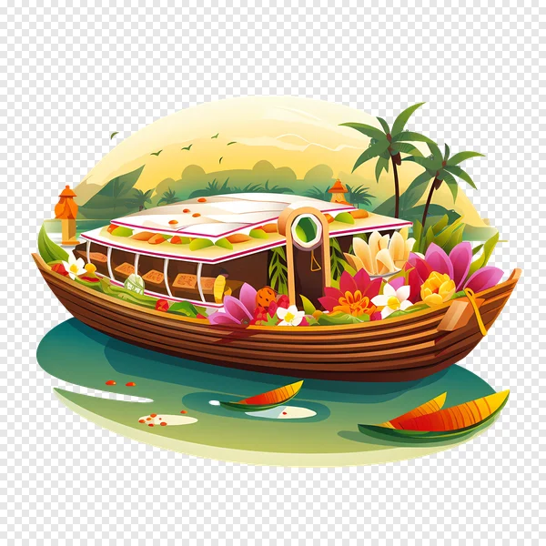 Immerse yourself in the serene beauty of South India with our vibrant Kerala Houseboat (Kettuvalam) illustration. This high-quality PNG features a beautifully decorated traditional boat adorned with colorful lotus flowers, floating peacefully on emerald backwaters under a golden tropical sky with palm trees. Perfect for adding an exotic touch to your graphic design projects, travel websites, cultural event promotions, or presentations. Download this stunning, transparent background image for free and bring the charm of Indian backwaters to life in your creative work!
