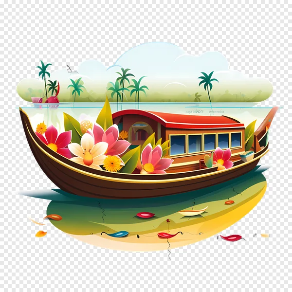 Immerse yourself in the serene beauty of South India with this vibrant, free PNG download featuring a traditional Kerala houseboat (Kettuvallam) gracefully adorned with colorful flowers. This charming vector illustration captures the essence of tropical backwaters, complete with lush palm trees under a calm sky and intriguing underwater reflections. Perfect for travel blogs, vacation planning, website design, presentations, or any creative project needing an exotic touch of nature and relaxation. Download this high-quality, transparent PNG image today and add a tranquil, picturesque element to your designs – absolutely free!