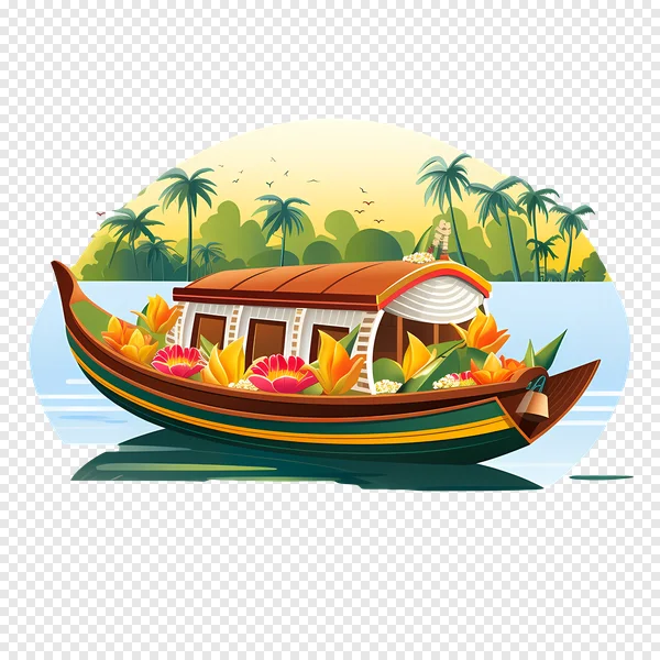 Tags: Indian boat Kerala houseboat Kettuvallam South India boat illustration cultural graphic exotic flowers free PNG nature palm trees serene scenery tourism traditional boat tranquil transparent background travel clipart tropical backwaters vacation illustration vibrant design waterway