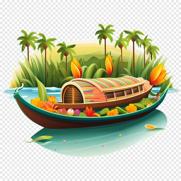 Immerse yourself in the tranquility of this free PNG featuring a stunning Kerala houseboat (Kettuvallam) on lush tropical backwaters. Adorned with vibrant flowers and surrounded by swaying palm trees, this colorful vector-style illustration evokes a peaceful Indian paradise. Perfect for travel-themed projects, cultural designs, presentations, or adding an exotic touch to any graphic. Download this high-quality, transparent image for free and bring your creative ideas to life!