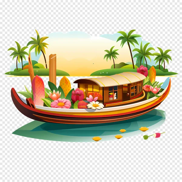 Download this stunning free PNG of a vibrant Kerala houseboat, perfect for capturing the serene beauty of India's backwaters. This charming illustration features a traditional Kettuvallam adorned with colorful tropical flowers, set against a picturesque backdrop of lush palm trees and tranquil waters under a warm sky. Ideal for travel brochures, website design, presentations, educational materials, or adding a touch of exotic charm to any creative project. Get this high-quality, transparent image for your designs today!