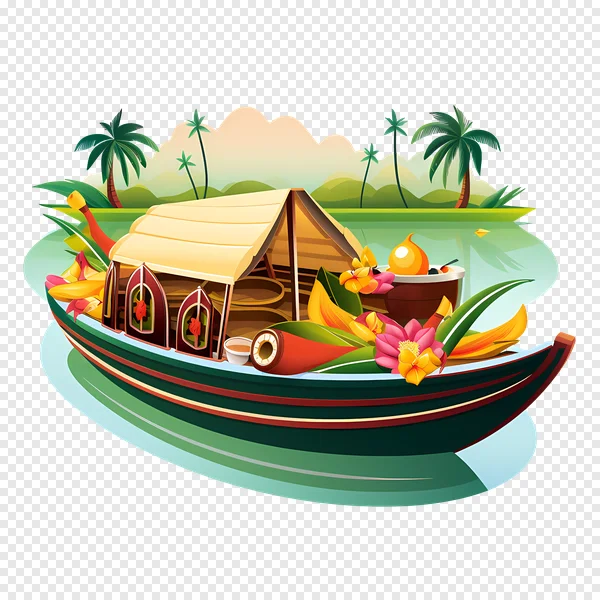 Dive into the serene beauty of South India with this vibrant, free PNG download featuring a traditional Kerala houseboat. Expertly decorated with colorful tropical flowers, lush green leaves, and a rustic roof, this charming boat floats on calm backwaters, framed by iconic palm trees and rolling hills. Perfect for travel blogs, cultural event promotions, festive designs, or adding an exotic touch to your creative projects. Download this high-quality illustration today to capture the spirit of Indian festivals and tranquil landscapes.