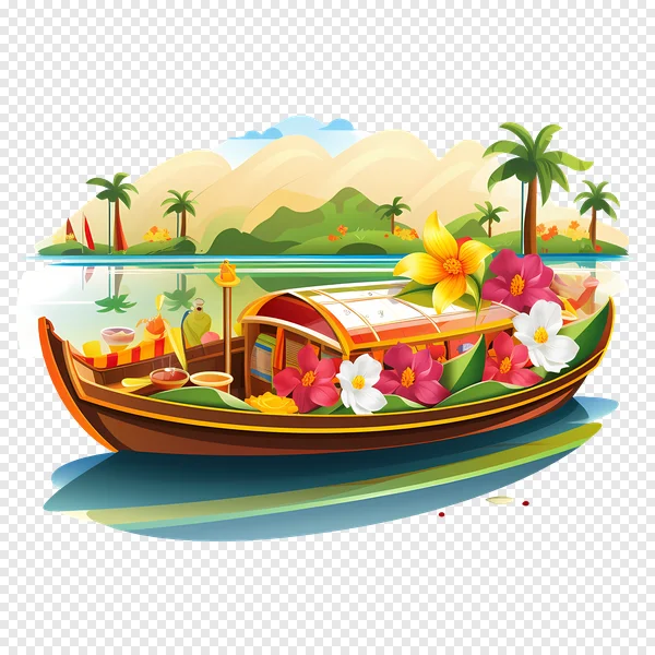 Discover our stunning free PNG of a vibrant Kerala houseboat, also known as a Kettuvallam, beautifully adorned with colorful tropical flowers in shades of pink, yellow, and white. This charming illustration captures a serene backwater scene, featuring lush green hills, swaying palm trees, and clear blue waters with reflections. Perfect for travel blogs, cultural presentations, holiday promotions, festive designs, or adding an exotic touch to any creative project. Download this high-quality, transparent image for free and infuse your designs with the rich cultural essence and tranquil beauty of India's backwaters. Ideal for digital art, website banners, social media posts, and more!