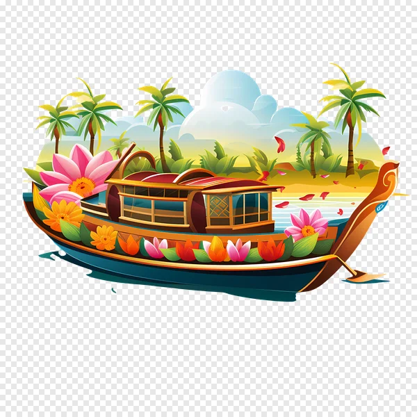 Transport your audience to a serene tropical paradise with this stunning free PNG of a traditional Kettuvallam houseboat. This vibrant illustration captures the tranquil beauty of Kerala's backwaters, adorned with lush palm trees, colorful pink and orange lotus flowers, and delicate falling petals. Perfect for travel blogs, cultural projects, presentations, or any design needing an exotic, peaceful touch. Download this high-quality, transparent background image for free today and add a unique charm to your creative endeavors!