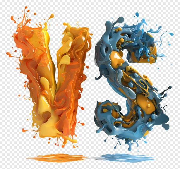 Download this captivating free PNG image featuring the letters 'VS' (Versus) brought to life with dynamic liquid splashes. The 'V' is rendered in vibrant orange and yellow hues, while the 'S' contrasts sharply in brilliant blue and gold, creating a striking visual impact against the deep black background. Each letter is composed of swirling, dripping liquid, giving an energetic and modern 3D effect. Perfect for conveying concepts of competition, contrast, comparison, challenges, or battles in your graphic designs, presentations, websites, and social media. Get this high-quality, transparent PNG for free and add a powerful, energetic visual to your projects today!