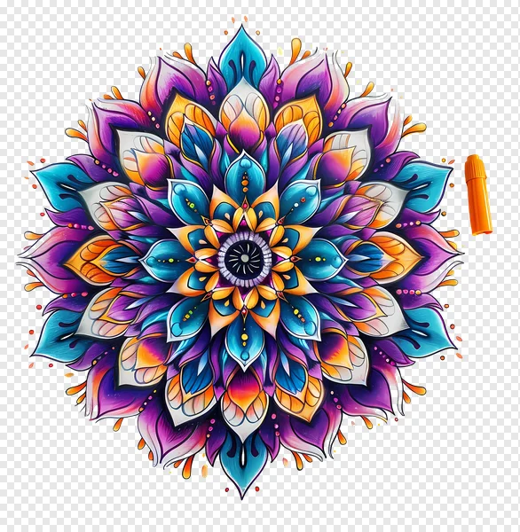 Unlock a world of color and intricate design with this stunning free PNG download featuring a vibrant, psychedelic mandala floral art. Adorned with rich purples, blues, oranges, and subtle whites against a striking black background, this high-quality image captures a beautiful symmetrical petal pattern. Notice the artistic touch with an orange marker subtly placed, hinting at creativity in progress. Perfect for spiritual graphics, creative projects, digital art, desktop wallpapers, website backgrounds, or unique decorations. Enhance your designs with this eye-catching and harmonious abstract illustration. Download this amazing, unique mandala PNG today and let your creativity flourish!
