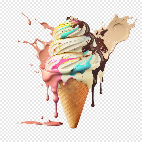 Download this eye-catching free PNG of a vibrant melting ice cream cone, perfect for adding a splash of color and sweetness to your designs! This high-quality graphic showcases creamy vanilla soft serve artfully drizzled with rich chocolate sauce and bright, colorful toppings in pink, blue, and yellow, creating an exciting dynamic splash and drip effect over a classic waffle cone. With its transparent background, this delicious dessert image is ideal for food blogs, social media posts, menu designs, summer promotions, website banners, digital art, or any project needing an irresistible sweet treat element. Unleash your creativity and make your content pop with this free ice cream cone PNG!