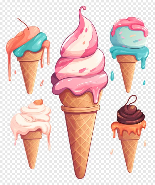 Dive into a delightful collection of five vibrant ice cream cones, perfect for adding a splash of sweetness to your projects! This high-quality PNG pack features various delicious treats, including a towering pink soft serve, a blue scoop with sprinkles and pink drizzle, another with orange syrup and a cherry, a creamy white soft serve, and a rich chocolate cone with caramel topping. Each illustration captures the irresistible charm of melting ice cream in a crisp, cartoon-style vector look with a transparent background. Ideal for menus, party invitations, website graphics, summer promotions, or any creative design craving a sweet touch. Download these mouth-watering dessert graphics for free and instantly elevate your visual content!