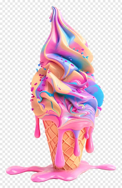 Indulge in this vibrant, free melting pastel swirl ice cream cone PNG! This eye-catching digital artwork features a delightful mix of pink, blue, purple, and yellow soft-serve ice cream, lavishly topped with colorful sprinkles and dripping sweet pink syrup onto a classic waffle cone. Perfect for summer promotions, dessert menus, party invitations, blog graphics, or any creative project needing a splash of whimsical color. Its transparent background makes integration seamless. Download this high-quality, delicious-looking dessert illustration instantly and add a sweet, playful touch to your designs!
