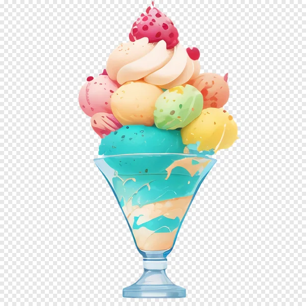 Download this eye-catching, multi-scoop ice cream sundae PNG for free! This vibrant illustration features an array of colorful ice cream flavors – pink, yellow, green, orange, and cool blue – generously topped with swirls of creamy whipped cream, a rich berry drizzle, and a classic cherry, all elegantly presented in a clear glass parfait. Perfect for adding a sweet, refreshing touch to your summer designs, menus, websites, social media posts, party invitations, or digital projects. Get this high-quality, transparent dessert clipart and enhance your visuals with a burst of delicious charm today!