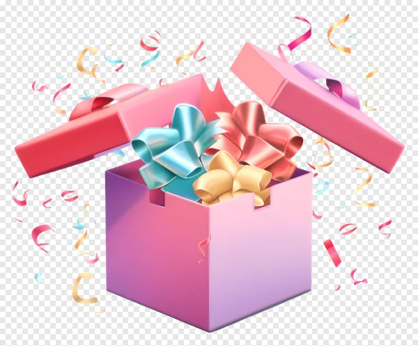 Unwrap the joy with our free, high-quality Open Gift Box PNG! This vibrant image features a beautifully rendered pink and purple gradient gift box bursting with colorful blue, pink, and gold bows, surrounded by festive confetti and streamers. Perfect for adding a touch of surprise and celebration to your graphic design projects, birthday invitations, holiday greetings, party flyers, or social media posts. Download now with a transparent background for seamless integration and elevate your designs with this cheerful, eye-catching present. Get ready to celebrate any special occasion!