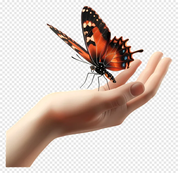 Discover this stunning, high-quality free PNG image featuring a vibrant orange and black butterfly delicately perched on an open human hand. This realistic 3D render, set against a striking black background, beautifully symbolizes nature's delicate beauty, gentle touch, freedom, and transformation. Perfect for graphic designers, web developers, or anyone needing captivating visuals for projects, presentations, digital art, or print. Download this elegant butterfly and hand PNG today to add sophistication and depth to your creative endeavors without cost!