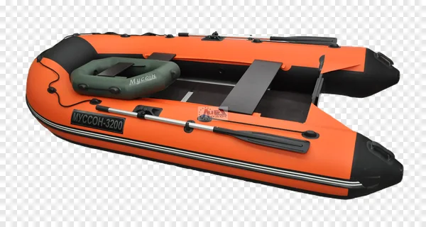 Download this striking, high-quality PNG of an orange and black inflatable boat, specifically the Musson-3200 model, ready for adventure! This versatile watercraft features two oars, comfortable internal seating, and a distinct green auxiliary inflatable element inside. Perfect for enhancing your marine-themed designs, fishing expedition graphics, water sports promotions, travel advertisements, or digital art projects. Get this transparent background boat image for free and add a splash of excitement to your visual content!