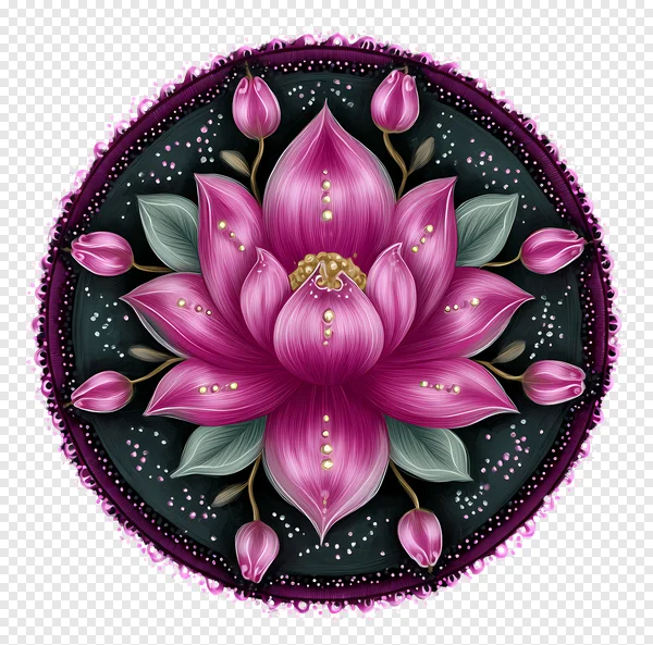 Discover our exquisite free PNG of a vibrant pink lotus flower mandala, a stunning digital artwork perfect for spiritual designs, meditation projects, or elegant decorative elements. This beautiful illustration features intricate magenta petals, delicate golden accents, and serene grey-green leaves, all framed within a dark, ornamental circle with shimmering details. Download this high-quality floral art for your yoga studio branding, greeting cards, web graphics, or personal creative ventures. Enhance your projects with this symbol of purity and enlightenment, available for instant free download and transparent background use.