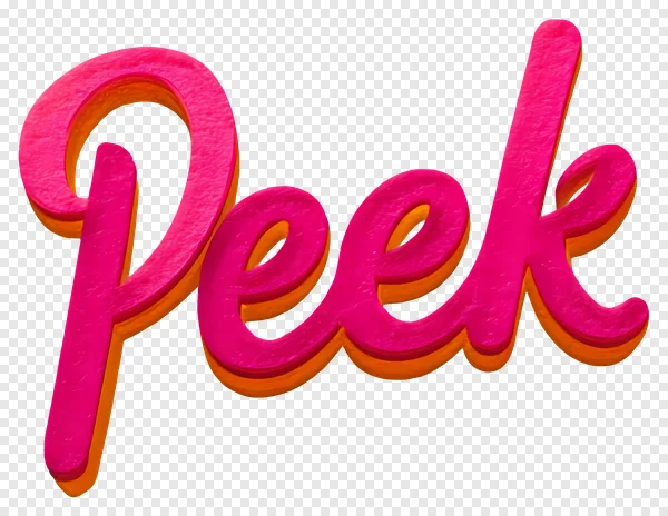 Download this eye-catching 'Peek' text PNG for free, featuring a vibrant hot pink hue with a warm orange 3D shadow effect. The stylized script font boasts a subtle, appealing texture, giving it a tactile and modern feel. This high-quality, transparent background image is perfect for adding a playful and energetic textual element to your social media graphics, blog headers, website banners, invitations, or any digital art project. Elevate your designs with this free-to-use 'Peek' word graphic – a fun, versatile asset for all your creative needs. Get your free download today!