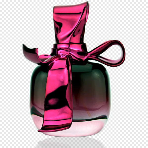 Discover this stunning free PNG image of a luxurious perfume bottle, perfect for adding a touch of elegance to your designs. Featuring a chic dark gradient glass bottle beautifully adorned with a vibrant metallic magenta pink bow and a uniquely sculpted cap, this high-quality transparent PNG is ideal for beauty blogs, fashion websites, cosmetic product showcases, digital art projects, marketing materials, and more. Download this exquisite fragrance bottle image now to enhance your creative projects with its sophisticated aesthetic and eye-catching color contrast. Get your high-resolution perfume PNG today, no attribution required!