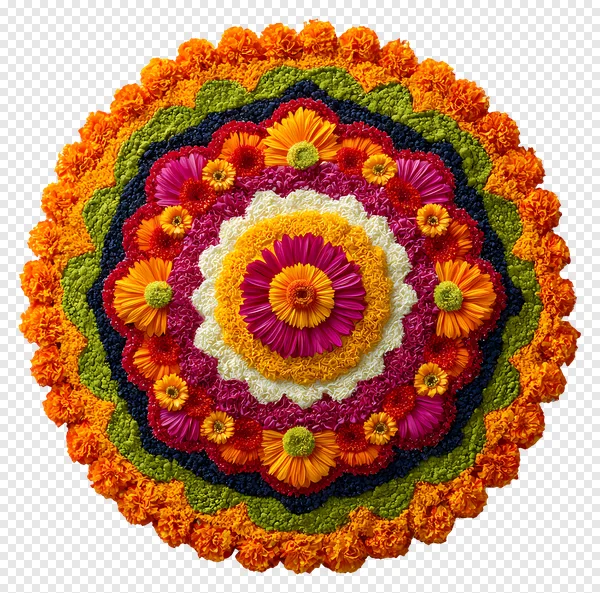 Tags: Diwali Hindu festival Indian festival Onam Pookalam Rangoli celebration colorful cultural festive floral design flower arrangement flower art gerbera mandala marigold petals traditional transparent PNG vibrant