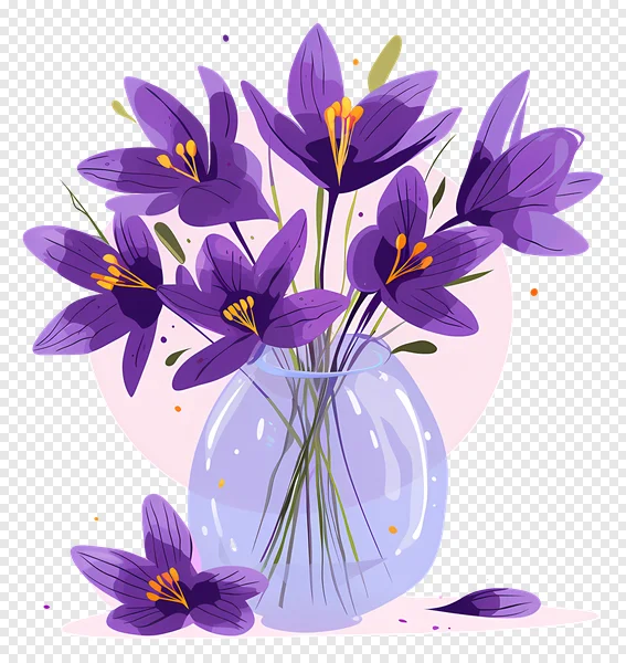 Download this exquisite PNG of vibrant purple crocuses elegantly arranged in a clear glass vase. This high-quality floral illustration features delicate green stems and prominent orange stamens, set against a subtle pink circular backdrop with a transparent background for easy integration into any design. Perfect for spring-themed projects, greeting cards, digital art, web design, invitations, or adding a fresh touch of nature to your creative works. Get this beautiful flower bouquet graphic for free and elevate your designs today! Enjoy its bright, cheerful aesthetic.