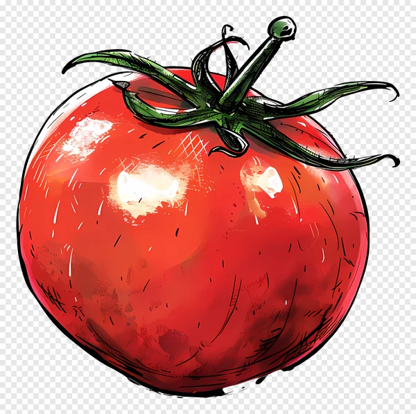 Tags: PNG calyx clipart cooking ingredient digital art food fresh produce garden glossy green stem hand-drawn healthy food illustration juicy red tomato sketch style tomato transparent background vegetable vibrant