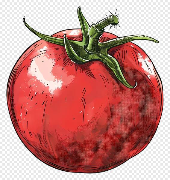 Download this stunning, high-quality vibrant red tomato PNG image for free! Featuring a fresh, ripe tomato with a detailed green stem and calyx in a unique hand-drawn illustration style. This transparent background PNG is perfect for culinary blogs, recipe cards, graphic design projects, educational materials, or adding a natural, healthy touch to any digital content. Easily integrate this beautiful red tomato clipart into your designs. Get your free transparent tomato image today!