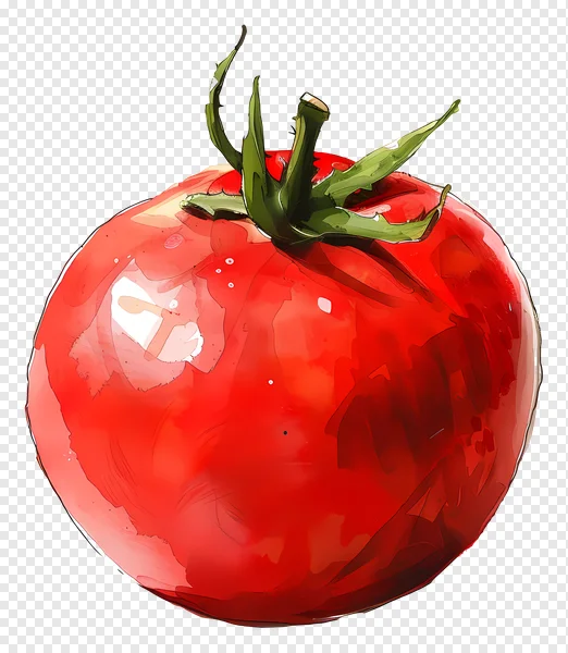 Download this stunning, free PNG image of a vibrant red tomato, beautifully rendered in a digital watercolor illustration style. Featuring a fresh green stem and crisp details, this high-quality graphic stands out against any background with its transparent design. Perfect for food blogs, recipe cards, healthy eating promotions, grocery store ads, menu designs, or any creative project needing a splash of fresh produce. Get your free transparent background tomato illustration today and add a touch of natural color and freshness to your designs! Ideal for both personal and commercial use.