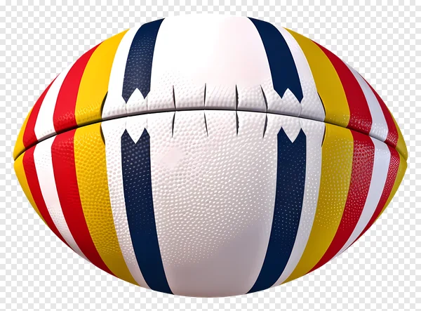 Download this stunning, high-quality PNG of a vibrant striped American football for free! This eye-catching 3D rendered sports ball features bold red, sunny yellow, crisp white, and deep navy blue stripes, showcasing intricate pebbled texture and visible laces. Perfect for sports-themed projects, digital design, website graphics, presentations, or school events. Its transparent background allows for seamless integration into any creative endeavor. Get this unique, dynamic, and colorful American football illustration without any cost and enhance your content with a professional touch. Ideal for game day promotions, team graphics, or abstract sports art.