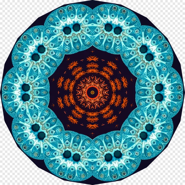 Discover a mesmerizing free PNG image featuring a vibrant teal and orange mandala kaleidoscope. This stunning abstract design showcases intricate patterns, radial symmetry, and a striking color contrast, perfect for digital art enthusiasts, designers, and spiritual art lovers. The outer ring displays complex blue and teal motifs, resembling stylized eyes and organic shapes, while the inner core radiates with fiery orange elements against a dark background. Use this high-resolution image as a decorative background, unique wallpaper, or an artistic element in your projects. Download this beautiful, high-quality mandala free for personal and commercial use and add a touch of mystical elegance to your creations!