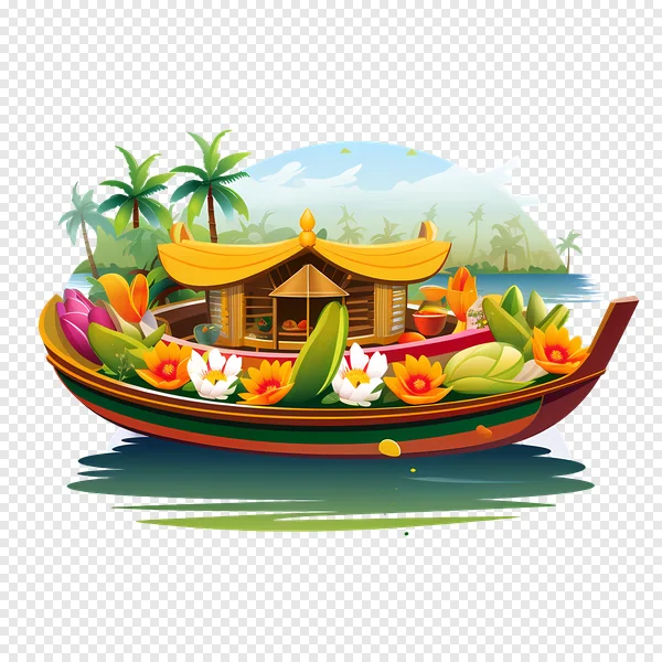 Discover this stunning, free-to-download PNG illustration featuring a vibrant, traditional Thai-style houseboat. Adorned with a distinctive golden roof, colorful tropical flowers like lotus and water lilies, and lush green leaves, this artistic render evokes the serene beauty of Asian floating markets or backwater landscapes. The background showcases tranquil water and verdant palm trees under a soft sky. Perfect for travel blogs, cultural projects, presentations, or adding an exotic, peaceful touch to any design. Enjoy high-quality vector art with a transparent background for versatile use.