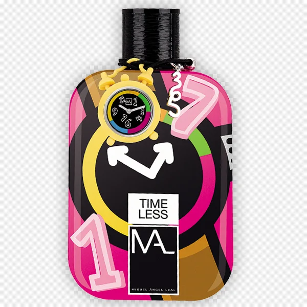 Download this captivating Timeless MAL perfume bottle PNG for free! This high-resolution image features a vibrant, abstract design with bold pink, yellow, black, and green geometric elements, embodying a modern pop art aesthetic. Adorned with a playful yellow alarm clock charm and stylized clock-face graphics, the bottle truly represents its 'Timeless' name by Miguel Angel Leal. Perfect for beauty blogs, graphic design projects, e-commerce listings, or creative advertising. Get this transparent background fragrance image now to add a touch of artistic flair to your work!