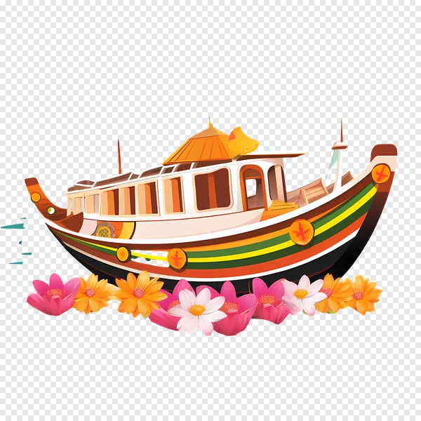 Immerse your designs in cultural beauty with this stunning free PNG of a vibrant traditional Kerala Kettuvallam houseboat. Featuring intricate details, a classic thatched roof element, and a hull adorned with rich stripes of red, green, and yellow, this illustration is beautifully complemented by a cluster of colorful pink, white, and orange lotus-like flowers. Perfect for travel blogs, cultural event promotions, festive greeting cards, website banners, or any project needing an authentic touch of Indian heritage. Download this high-quality, transparent background PNG instantly and add an exotic, festive flair to your creative work. Ideal for tourism, celebrations, and educational materials.