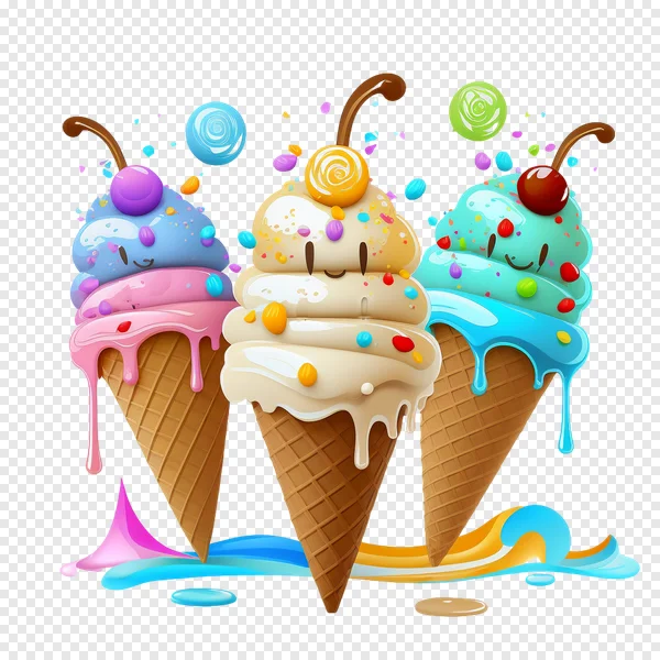 Indulge in this delightful free PNG download featuring three vibrant, colorful ice cream cones! Each kawaii-faced scoop is generously adorned with an array of sprinkles, candies, lollipops, and cherries, making them irresistibly cute. From pink and purple to creamy vanilla and cool mint, these melting sweet treats in classic waffle cones are perfect for adding a touch of summer fun to your designs. Ideal for websites, digital art, party invitations, educational materials, or personal projects. Download this high-quality, transparent background ice cream illustration today and bring a pop of sugary charm to your creations!