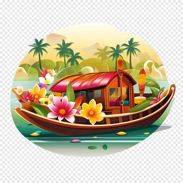 Tags: Asian boat cartoon boat digital art exotic flowers floral design free PNG houseboat illustration longtail boat lush landscape nature scene palm trees paradise graphic serene summer vacation traditional vessel travel illustration tropical boat vibrant colors water scene