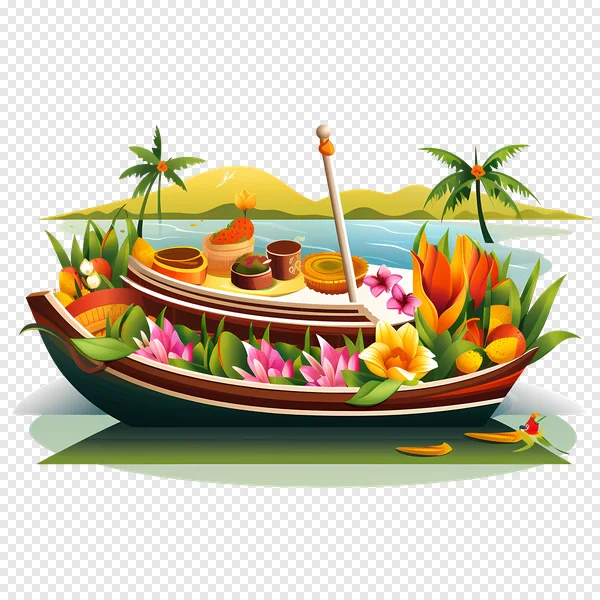Discover this captivating free PNG image featuring a beautifully decorated tropical boat overflowing with exotic flowers like pink lotus and vibrant bird of paradise blooms, alongside ripe, colorful fruits. In the background, lush palm trees frame a serene blue sea and golden hills, evoking a perfect holiday paradise or an Asian festival celebration. This high-quality illustration with a transparent background is ideal for enhancing your summer designs, travel promotions, cultural event graphics, website banners, or any project needing a touch of vibrant, festive charm. Download now and bring a splash of tropical wonder to your creative work!