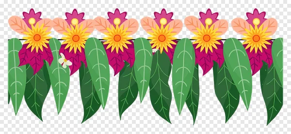 Enhance your creative projects with this stunning, high-quality Tropical Floral Border PNG. Featuring a vibrant repeating pattern of bright yellow flowers with orange centers, bold magenta and soft peach leaves, and lush green foliage, accented with a delicate white blossom. This decorative garland design is perfect for adding a touch of nature and festivity to invitations, greeting cards, website banners, social media posts, scrapbooking, and other design work. With its transparent background, it seamlessly integrates into any project. Download this beautiful botanical illustration for free and bring a splash of color to your designs today! Ideal for summer, spring, and celebration themes.