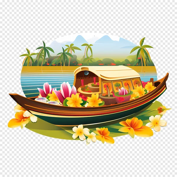 Download this beautiful, vibrant PNG illustration featuring a traditional tropical boat adorned with an abundance of colorful flowers. The scenic background includes lush palm trees, serene blue waters, and distant mountains, evoking a sense of peaceful travel and exotic relaxation. Perfect for websites, presentations, or creative projects, this high-quality graphic comes with a transparent background. Get your free download now and add a touch of paradise to your designs!