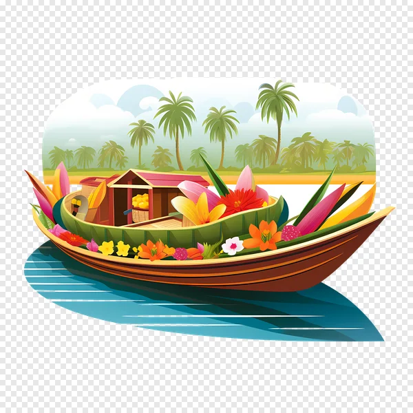 Immerse yourself in a tropical paradise with this vibrant flower boat PNG illustration! Featuring a beautifully decorated wooden canal boat adorned with an abundance of exotic, colorful blooms and lush leaves, set against a serene background of swaying palm trees and clear blue waters. This high-quality, transparent background PNG is perfect for adding a touch of festive, natural beauty to your graphic design projects, presentations, or website. Download this charming, vacation-inspired artwork for free and bring your creative ideas to life. Ideal for themes like travel, nature, relaxation, or cultural celebrations.