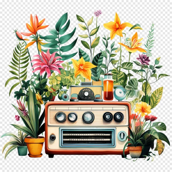 Download this stunning free PNG of a vintage-inspired radio surrounded by a lush array of vibrant tropical flowers and exotic plants. This high-quality, colorful botanical illustration features a delightful retro aesthetic with rich green foliage, bright orange, pink, and yellow blooms, all presented on a transparent background. It's perfect for digital art projects, website design, social media graphics, or adding a unique blend of nature and nostalgia to your creative works. Get this artistic floral and music-themed image instantly to enhance your designs!