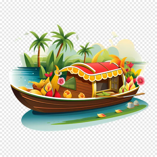 Immerse yourself in the tranquility of a tropical paradise with this captivating, high-quality PNG illustration. Featuring a beautifully designed wooden houseboat, complete with a distinctive red and yellow roof, gracefully floating amidst lush palm trees and vibrant, colorful flowers. This picturesque scene on serene blue-green water evokes feelings of relaxation, vacation, and exotic travel. Perfect for enhancing travel blogs, digital presentations, website banners, social media posts, or any creative project needing a touch of natural beauty and adventure. Download this transparent, free PNG now to bring a touch of the tropics to your designs!