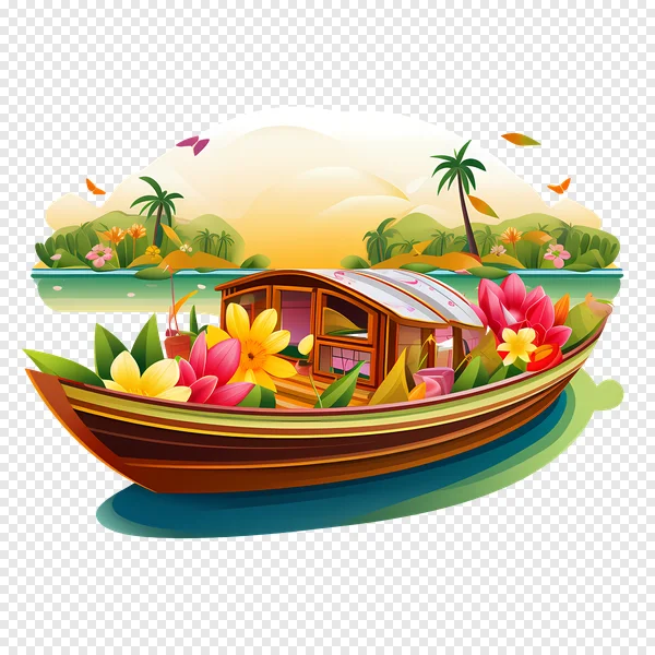 Download this stunning, free PNG illustration featuring a vibrant tropical houseboat adorned with beautiful pink and yellow flowers, gracefully floating on calm turquoise waters. The backdrop reveals lush green islands, swaying palm trees, gentle hills, and a warm, golden sunset sky, creating an idyllic paradise scene. Perfect for travel websites, summer campaigns, vacation promotions, digital art projects, or any design needing an exotic touch. This high-quality, transparent background vector-style image is ready to enhance your creative work. Get your free download today and add a splash of tropical serenity!