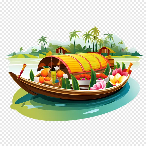 Immerse yourself in the serene beauty of the tropics with this stunning free PNG download. Featuring a vibrant houseboat gracefully sailing through calm backwaters, this idyllic illustration is adorned with lush palm trees, colorful flowers like lotus and tropical blossoms, and inviting refreshments including fresh fruits. Perfect for travel blogs, vacation planning, graphic design projects, or adding a touch of peaceful paradise to your website. Download this high-quality vector-style image for free and capture the essence of a tranquil getaway, reminiscent of Kerala's famous backwaters. Ideal for presentations, digital art, and any creative endeavor needing a splash of tropical charm and a holiday vibe.