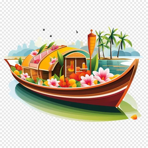 Tags: India Kerala PNG backwaters clip art exotic flowers free download holiday houseboat illustration palm trees serene traditional boat transparent travel tropical vacation vector art vibrant
