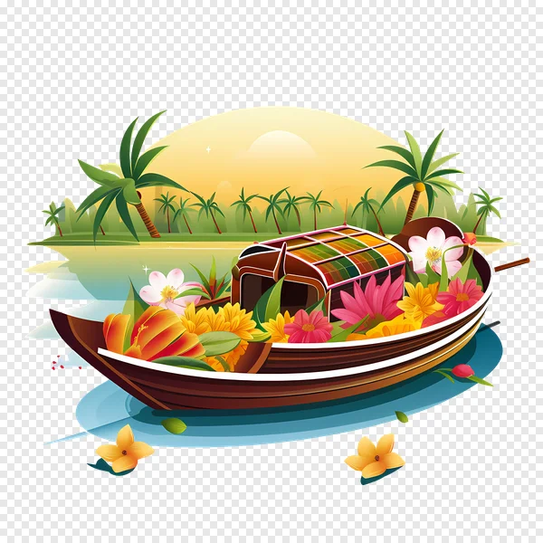 Immerse your projects in the serene beauty of the tropics with this vibrant free PNG download. Featuring a beautifully adorned traditional houseboat, overflowing with colorful flowers like pink lotus, yellow marigolds, and white blossoms, set against a tranquil backdrop of lush palm trees and a warm sunset over calm waters. Perfect for designs celebrating travel, nature, South India, or relaxation. This stunning illustration captures the essence of a peaceful Kerala backwaters scene, ready to enhance websites, presentations, and creative works. Download this high-quality tropical landscape vector-style PNG transparent image for free and add a touch of exotic charm!