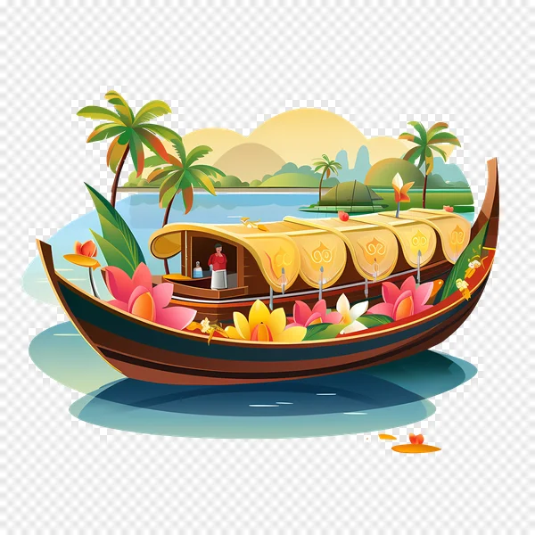 Embark on a visual journey with our stunning free PNG of a traditional tropical longboat. This vibrant vector illustration captures the essence of an exotic river cruise, featuring a beautifully decorated boat with golden canopies and an abundance of colorful lotus flowers. Palm trees line the tranquil waters with lush green mountains in the background, creating a serene vacation ambiance. Perfect for travel websites, cultural presentations, greeting cards, or adding a touch of peaceful tropical charm to your designs. Download this high-quality, transparent PNG for free and bring the beauty of Southeast Asian waterways to your next project today!